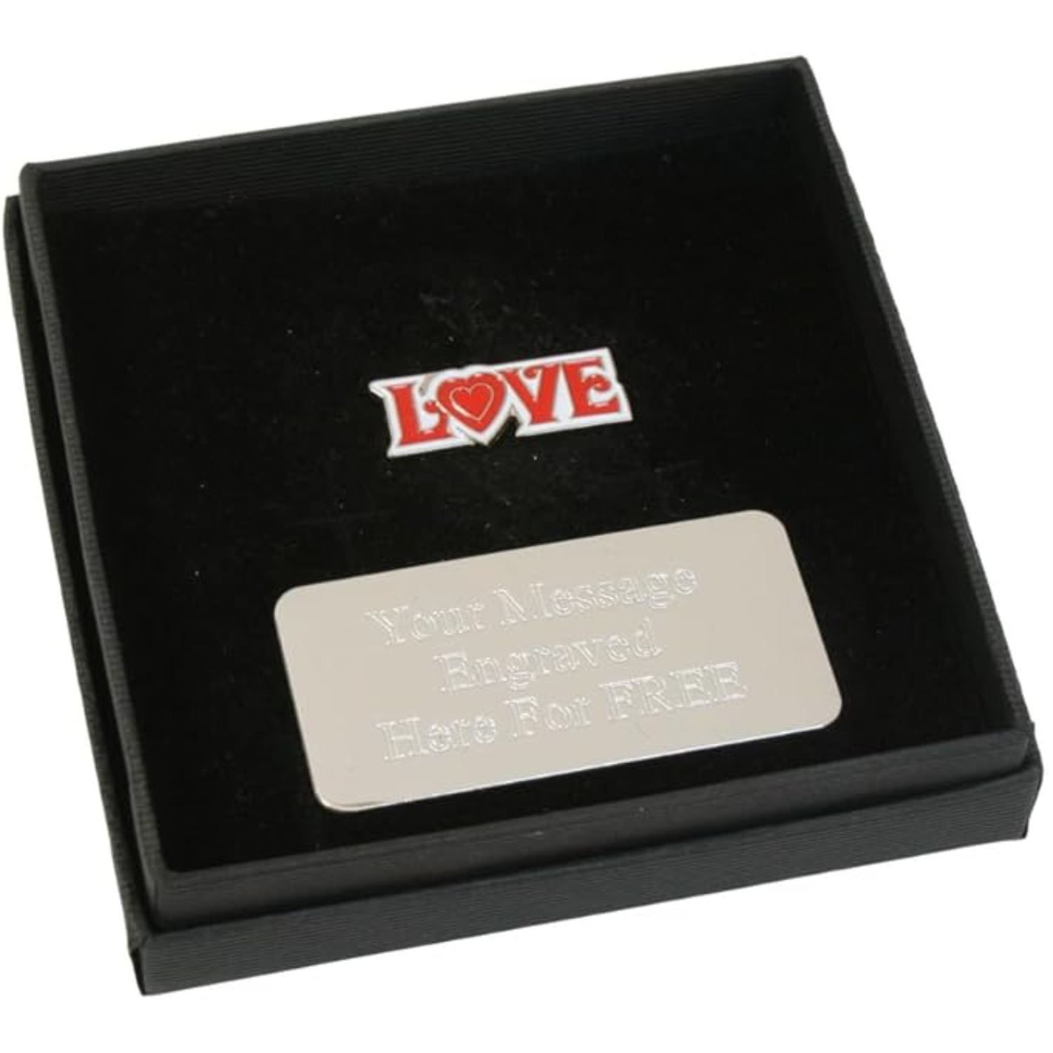 We offer this love motif as a lapel pin badge or a tie slide. Please select your preferred item type and packaging from the available variations.